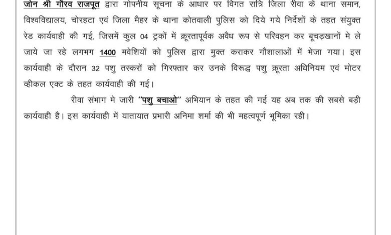 पशु तस्करों के विरुद्ध रीवा जोन पुलिस की अब तक की सबसे बड़ी कार्रवाई– संगठित तस्करी नेटवर्क पर कसा शिकंजा, भारी संख्या में पशु बरामद, कई गिरफ्तार