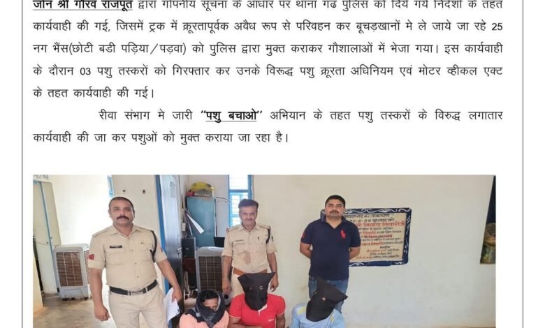 रीवा ज़ोन पुलिस की बड़ी कार्रवाई: 25 गोवंशों को तस्करों से छुड़ाया, 3 आरोपी गिरफ्तार