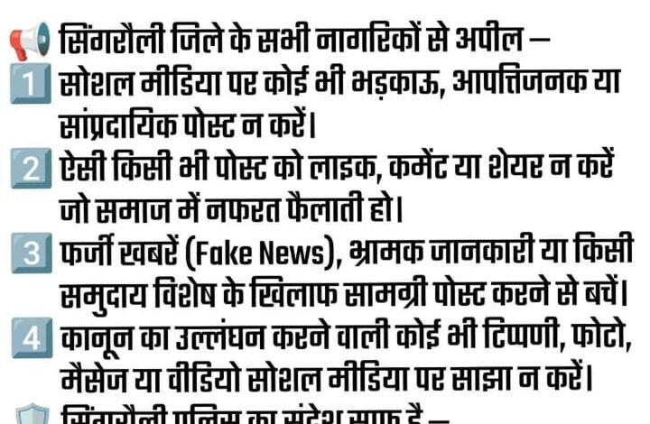सिंगरौली पुलिस ने सोशल मीडिया पर भड़काऊ, विवादित और समाज में वैमनस्य फैलाने वाली पोस्ट को लेकर कड़ा रुख अपनाया है। पुलिस अधीक्षक कार्यालय से जारी जनहित विज्ञप्ति में स्पष्ट किया गया है कि ऐसी किसी भी पोस्ट पर तत्काल कानूनी कार्रवाई की जाएगी।