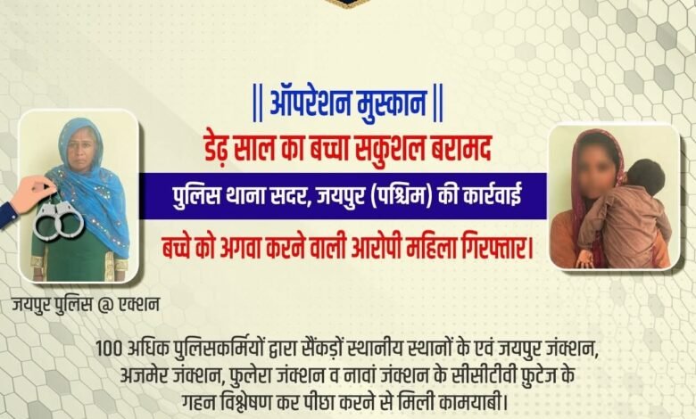 ЁЯЪи рдЬрдпрдкреБрд░ рдкреБрд▓рд┐рд╕ рдХрд╛ рдСрдкрд░реЗрд╢рди рдореБрд╕реНрдХрд╛рди рд╕рдлрд▓ тАФ рдбреЗрдврд╝ рд╕рд╛рд▓ рдХрд╛ рдЕрдЧрд╡рд╛ рдмрдЪреНрдЪрд╛ рд╕рдХреБрд╢рд▓ рдмрд░рд╛рдордж, рдЖрд░реЛрдкреА рдорд╣рд┐рд▓рд╛ рдЧрд┐рд░рдлреНрддрд╛рд░