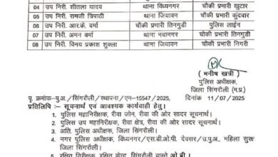 एसपी मनीष खत्री ने जारी किए तबादला आदेश, जिले में नई जिम्मेदारियों के साथ तैनात हुए अधिकारी सिंगरौली। जिले के…